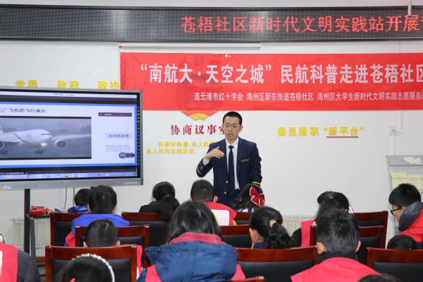 “知是行之成”,想要有所成就,知识一定要丰富。线上的科普活动在如火如荼展开的同时,“天空之城”团队也在线下展开校社合作。团队了解到国内很多青少年有飞行梦想或对飞行知识抱有强烈兴趣,但是资源却很少的情况,为让更多青少年有机会接触飞行,团队成员在连云港、宿州两地社区、中小学等青少年活动地点开展参观、教育和体验活动,为当地青少年安排线下科普课程。队员们与社区沟通,安排场地与时间,组织报名,为青少年们安排了关于飞行的知识科普课,将飞行的梦想种在广大青少年的心中,让仰望蓝天成为常态,让理想的光芒照耀他们的心房。参与旁听的家长们评价:“充分利用图文知识、飞机模型,寓教于乐,让我们看到了未来飞行员的责任与担当,希望未来能够多举办一些类似的活动。”