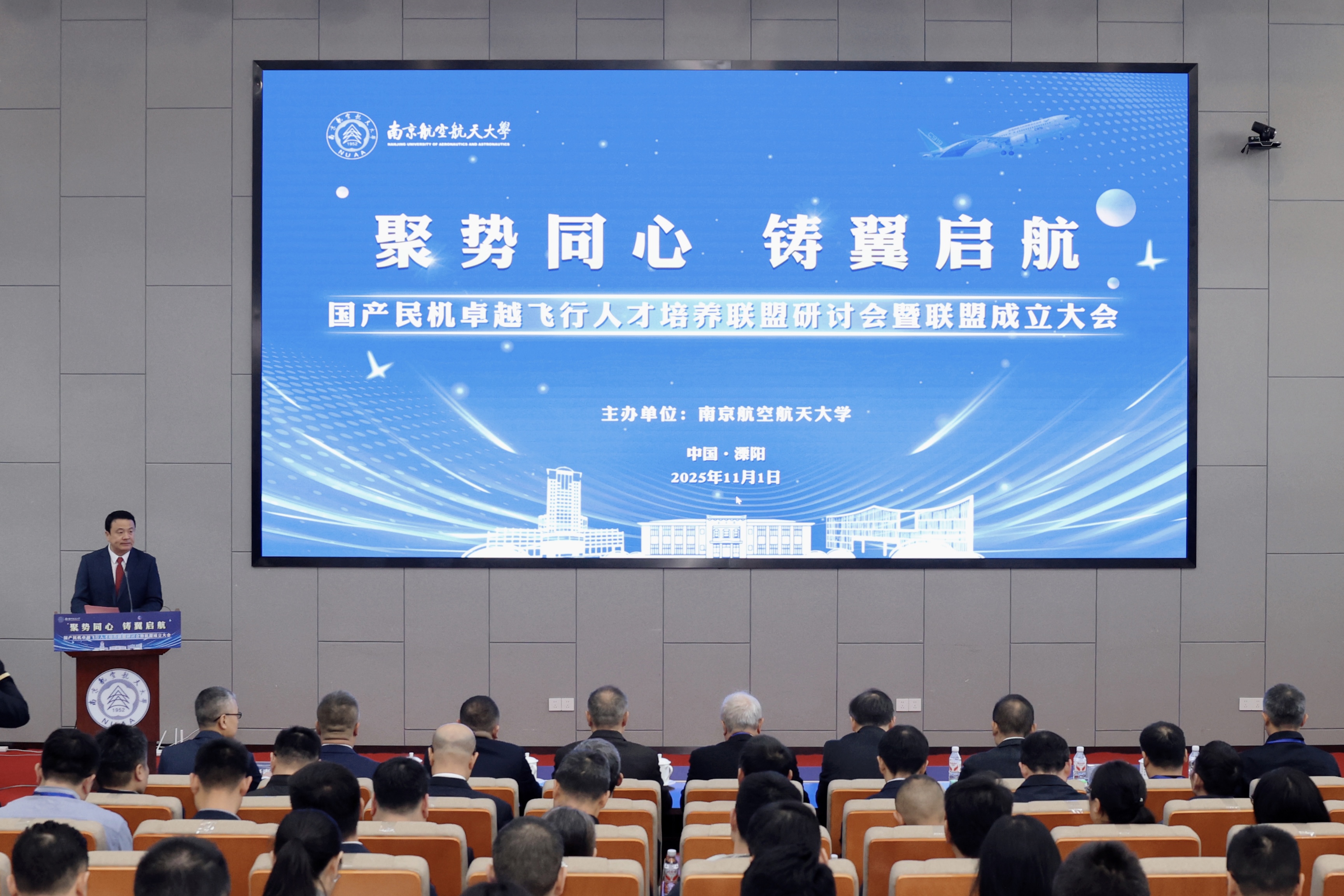 11月1日,国产民机卓越飞行人才培养联盟研讨会暨联盟成立大会在我校举行。中国工程院院士、中国商用飞机有限责任公司首席科学家、国产大飞机C919总师吴光辉,中国民用航空江苏安全监督管理局局长、党委书记郑学荣,溧阳市副市长方学军,中国民用航空飞行学院党委副书记王维正,中国国际航空股份有限公司副总飞行师兼飞行技术管理部总经理刘春江,中国东方航空股份有限公司飞行技术管理部副总经理周晓青,中国南方航空股份有限公司飞行总队总队长助理、飞行训练管理部副总经理张云涛,中国航空技术国际控股有限公司航空运营支持事业部副总经理蒋金,春秋航空股份有限公司副总裁沈巍,成都航空有限公司总飞行师王芃,深圳航空有限责任公司人力资源部总经理曾小锋,厦门航空有限公司飞行技术管理部党委书记罗艳,山东航空股份有限公司飞行技术管理部总经理王一潭,上海吉祥航空股份有限公司飞行标准管理部副总经理毛鑫,中国民航大学飞行分校副校长陈斌,我校党委常委、副校长张启钱等出席大会。大会由我校英国365集团公司党委书记高健主持。