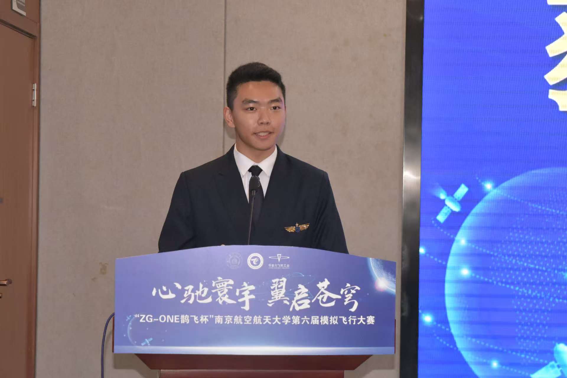 获奖学生代表阳宁结合自身备赛参赛经历,分享了在模拟飞行中的收获与成长,表达了对飞行的真挚热爱,并承诺将继续发扬团队协作精神,不懈努力,为南航大模拟飞行队再创佳绩。